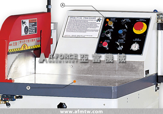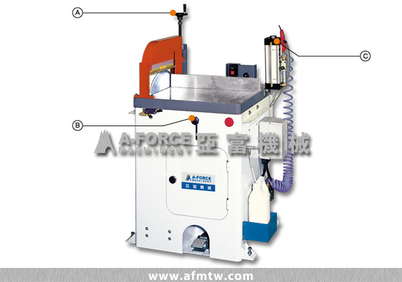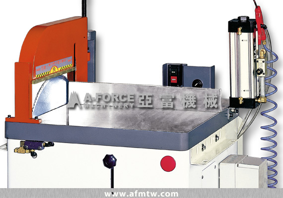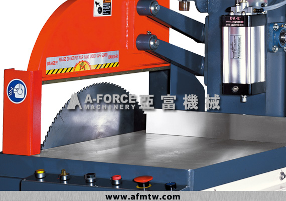 - 壓料系統及鋸切系統分別由各自獨立的空壓缸來控制,可依據材料類型分別調整壓料速度及鋸切速度,從而達到鋸切較穩定效果(可快速穩定鋸切材料);且壓料系統可完整緊密的壓住材料。